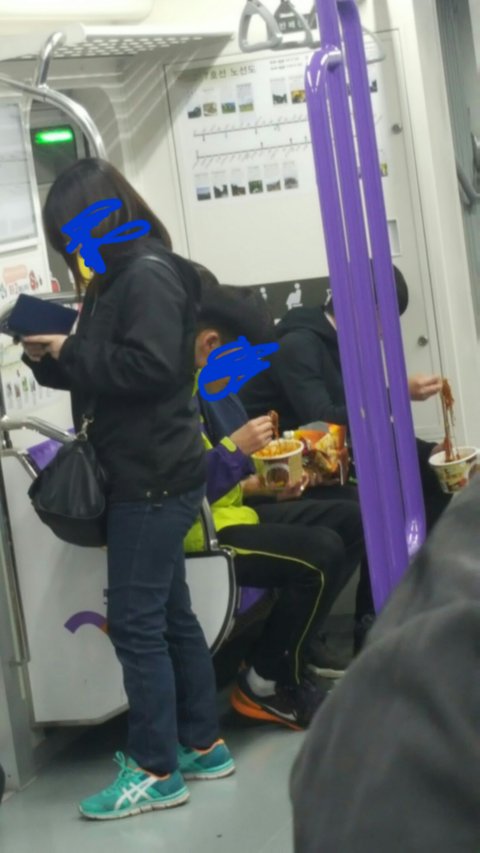 바로 몇년전에 여학생이 다 빈 지하철에서 라면먹는걸로 온갖 비난을 다 당했는데 여긴 붐비는 지하철에서 쌍으로 라면.. 어떤 비난이 달릴지?ㅋ