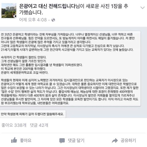 2월초 은광여고 졸업식장에서 200억을 투자했는데 입시결과가 이게 뭐냐며 졸업하는 아이들을 비난했던 그가 이제는 자신의 페이스북 대문에 은광여고 아이들과 찍은 사진을 내걸고 자신의 출세야망에 아이들과 학교를 이용하고 있다.