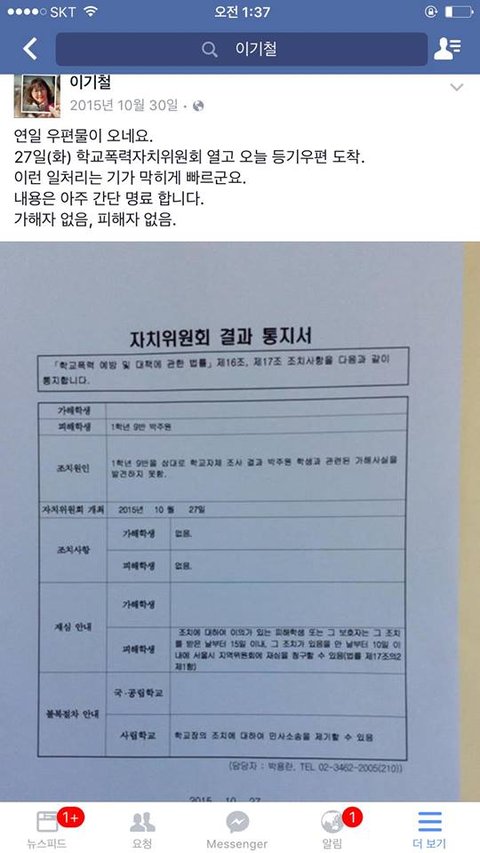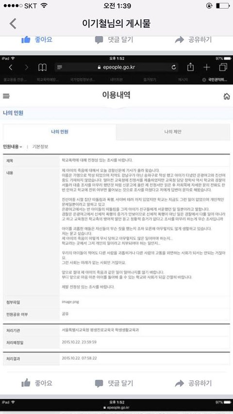 17살 어린 딸이 학교폭력을 당하여 너무나 힘들어 하며 매일밤 악몽에 시달리고 고통스러워 하다가 끝내 더이상 한발자국도 나갈 수 없다며 옥상에서 자신의 몸을 던져 이 세상을 향해 저항했다.