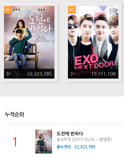웅녀들, 오랜만에 도전에 반하다 순위가 궁금해서 지금 찾아봤어 2015년 네이버TV캐스트 최고의 컨텐츠인 만큼, 누적순위는 부동의 1위야 꺄~!! 그런데 주간순위 월간순위에서도 아직 상위권!!! 오래 오래 사랑받는 거 같아서 진짜 기분 좋다 >.<