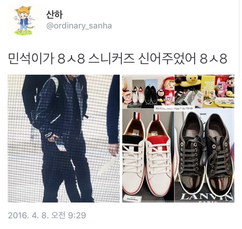 우와 산하님 신발 이쁘다고 생각했는데 민석이가 바로 딱 착용.오메~