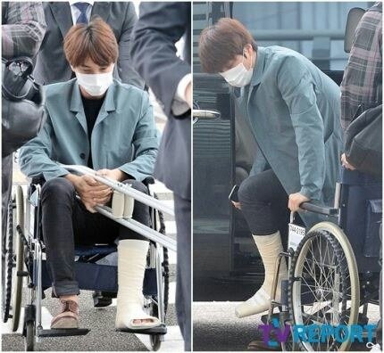 깁스하고 휠체어 탄 카이