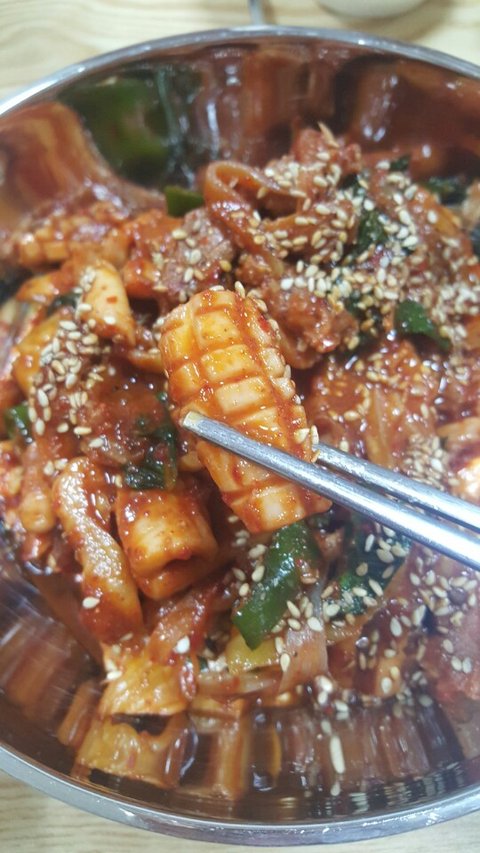 오징어, 돼지 앞다리살, 양념 넣고 볶으시다가 90% 익었을 시점에서