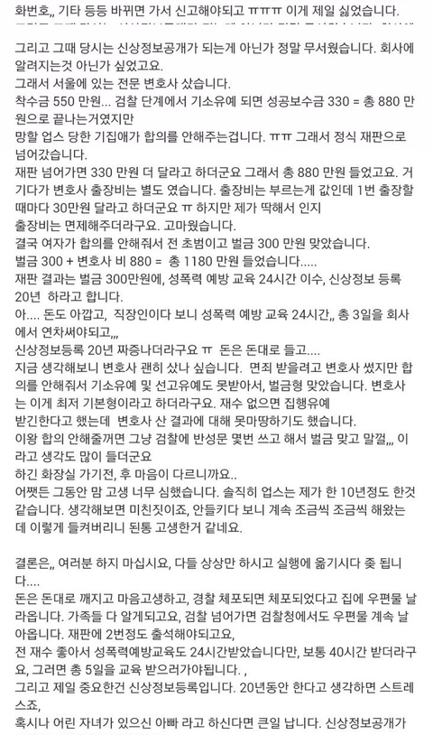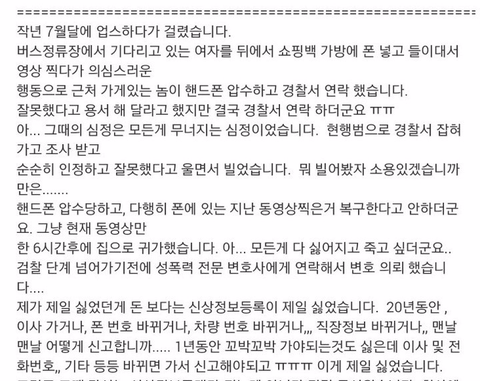 저런 새끼들은 재수없게 걸렸다고 생각할 뿐 반성 절때 안합니다. 저런 새끼가 멀쩡히 회사다닐거란 걸 생각하니 울화가 치미네요. 같은 회사 직원들도 알아야하는 거 아닌가요 쟤 백퍼 여직원들도 찍었을듯