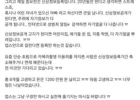 10년동안 여자 치마 속 사진 찍고 다닌 새끼가 그동안의 사진들 복구 조차 안받고 고작 '벌금형' 받는 나라인데 그것조차도 그들은 억울하다며 징징거린다