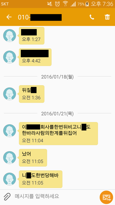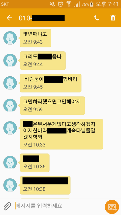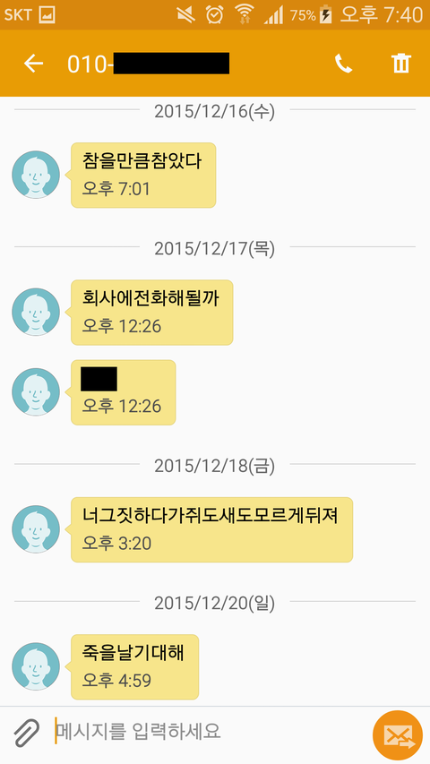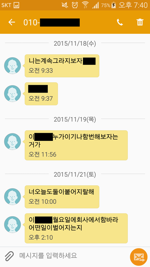 문자 내용 보시면 알겠지만 전 여자친구가 저희 회사에 찾아와서 난동을 피우겠다는 협박을 많이 했었습니다. 그러다가 한 번 실제로 저희 회사에 찾아와서 1층에서 난동을 피우고, 저를 만나겠다며 사원증 찍는 울타리를 넘어가려고 하길래 경비하시는 분들이 저지했고, 저지당한 전 여자친구는 로비에서 기물 파손과, 저지하는 직원들을 폭행하여 고소를 당한 적이 있습니다. 그런데 그렇게 고소를 당한 후에도 전 여자친구는 정신을 못 차리고 저한테 계속 욕설과 협박 문자를 보냈습니다.