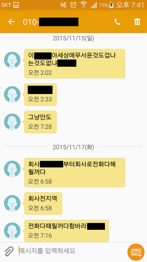 폭행건으로 저희 직원들에게 고소 당한 것과, 저에게 욕설, 협박으로 고소당한 것 외에도 저에게 1분에 수십통씩 음성통화와 영상통화를 걸어서 목소리를 들려달라고 하거나 얼굴을 보여달라고 했고, 카톡 등의 메신저로도 협박 메시지를 보내고, 이별 초기에 저희 회사 지하 주차장에 몰래 들어와서 제 차 옆에서 제가 퇴근할 때 까지 무작정 기다리며 저한테 제발 다시 자기를 만나달라고 울고불고 무릎 꿇고 빌고, 전 여자친구의 아버지과 장애가 있는 어머니까지 힘들게 모셔와서 자기 딸 다시 만나달라고 저에게 비는 등 수많은 일들이 있었지만 그걸 하나하나 다 쓰자면 가뜩이나 긴 글이 더욱 길어질 것 같아 생략하겠습니다. 그리고 글에 첨부한 사진에서 가장 예전에 전 여자친구에게 협박 문자를 받은 날짜가 2015년 11월 17일의 문자이지만, 이별한 후인 2014년도부터 저는 전 여자친구의 욕설과 협박 문자에 시달렸었습니다. 그리고 글에 첨부한 전 여자친구가 보낸 문자들에 가려진 부분은 차마 미성년자나 임산부 등도 여과 없이 보는 공개적인 사이트에 게시할 수 없는 심한 욕설 등과 저와 타인의 실명, 저희 회사명입니다.