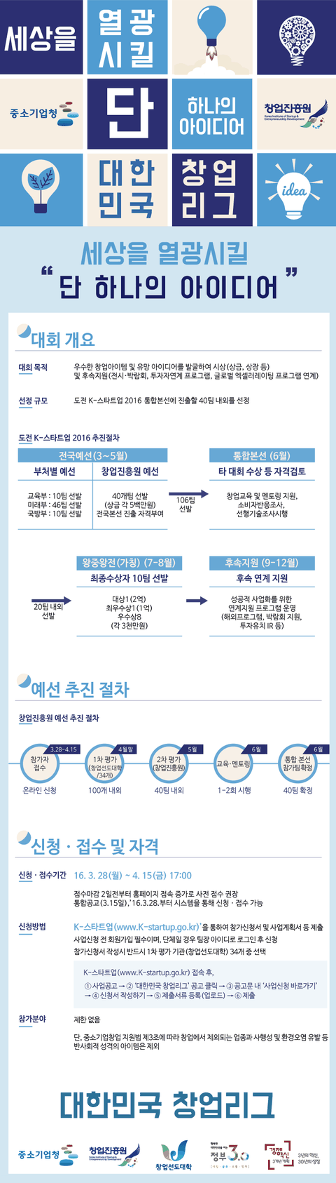 기발한 아이디어와 아이템은 있는데 세상밖으로 보여줄 힘이 없던 분들은 이번 대한민국 창업리그