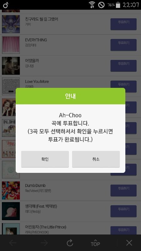 3. 그걸 누르고 타가수 2명+러블리즈의 아츄 총 3곡을 투표해야 투표 완료가 됨! (되도록이면 현재 나온곡 보다는 전에 곡을 해야 좋을꺼같아)