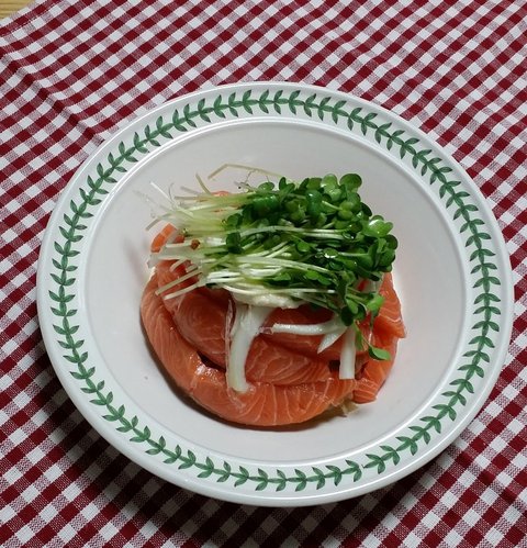 사케동이 너무 먹고 싶어서 혼자 또 밥하고 간장 만들어서 연어 올리고 무순 올려서 완성!