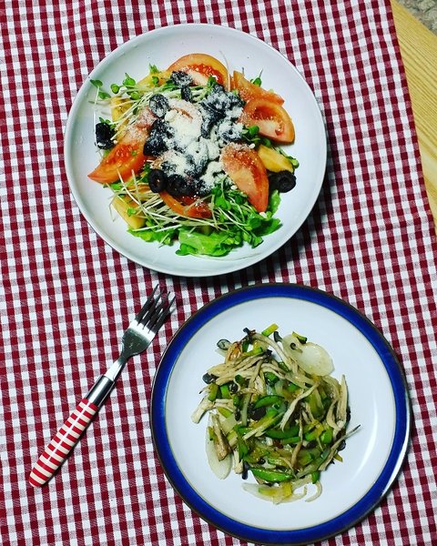 냉장고에 있는 채소들 다 끌어끌어 모아 탄생한 샐러드와 버섯볶음.