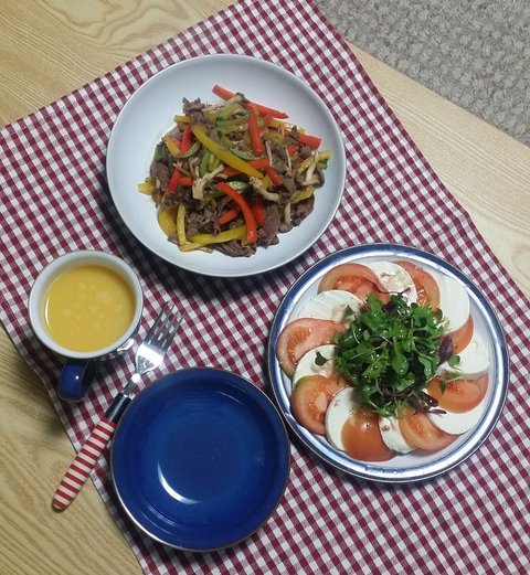 소고기와 파프리카, 호박넣고 볶다가 후추와 소금으로 간 그리고 토마토 카프레제