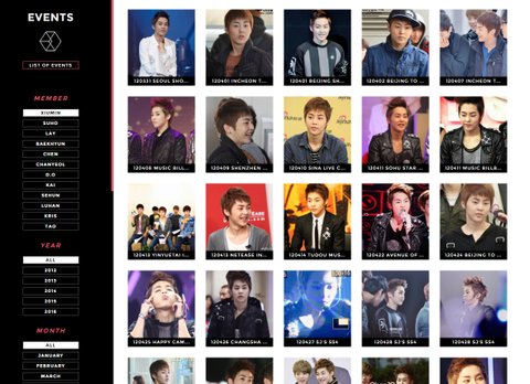 왼쪽에 멤버,연도,월,이벤트(행사종류) 선택하면선택한대로 데뷔때부터 날짜 순서대로 쭉 볼 수 있어