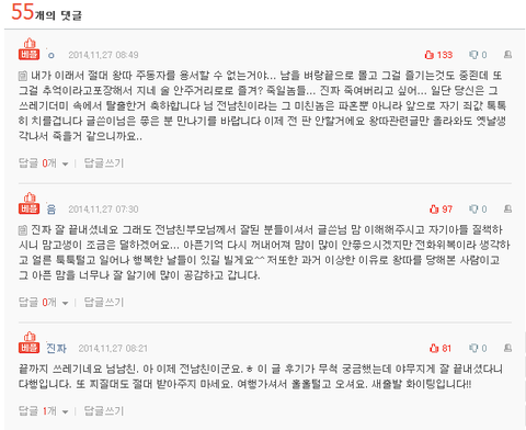 비슷한 사연은 여러 번 올라왔지만 이 사연은 그중에서도 제대로 인과응보 작렬이군요. 학생 때 왕따나 하고 다니던 것들이 나중에 어른돼서 저렇게 파혼당할 거 생각하니 꼬시네요>_< 심지어 저 케이스의 남자는 자기 부모(그나마 똑같이 쓰레기는 아니고 뒤늦게나마 반성할 줄 아는 사람들이었군요. 어차피 그때 제대로 아들내미 정신머리를 고쳐놓지 못한 탓에 모든 게 늦어버리고 말았지만..)한테까지 팽...까지는 아닌가?? 멸시당하게 생겼으니;;