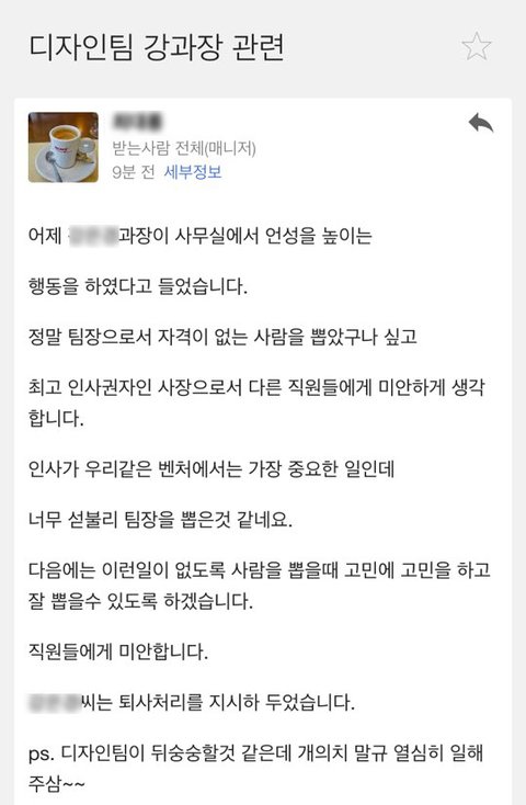 - 카톡도 전체 메일로 pc카톡 너무 심하게해서 회사 분위기 흐리는 직원이 있다면서 사장이 메일 보냈었음. 저도 그때 입사한지 얼마 안됐고 총무님도 새로 오셨는데 분위기 완전 싸했었져.