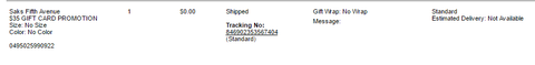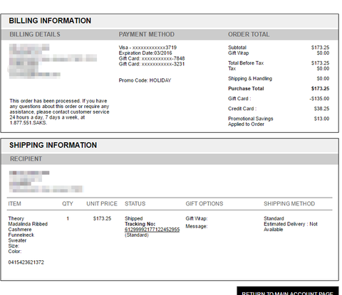 2014년 12월 saks에서 추가 구매를 했는데 기프트카드만 있었다면 200불이 넘지 않았을텐데