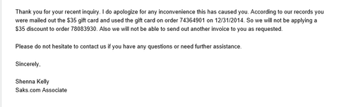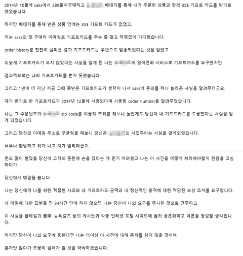 그랬더니 saks에서 답변이 오기를 제 기프트카드가 주문번호 xxxxx에서 사용이 되었다는 거예요.