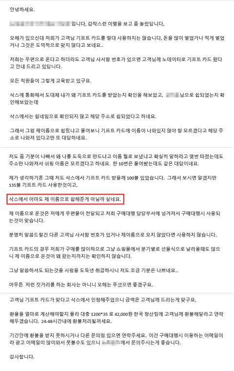 emali도 쓰고 영어전화대행서비스도 했지만 기프트카드를 다시 돌려받지 못했고 그 사건은 그렇게 종료되었어요.