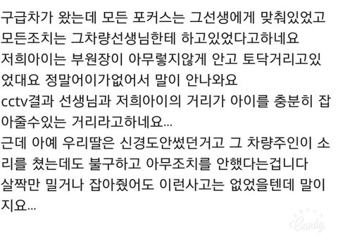 경찰서에가서 블랙박스 확인하니 20미터쯤에서 suv차량이 밀려오고있었고 차량선생님과 저희딸이 그차량을 봤대요 분명 저에게 첫전화가 왔을땐 부원장이란사람이 차량선생님이 저희딸을 몸을던져 막았다고했습니다..근데 사고차량 블랙박스확인하니 선생이 우리아이를 몸으로막은 영상은 없었고 애를 조금만 옆으로 밀거나 소리를 질렀어도 이런끔찍한 사고는 없었을거라고하네요