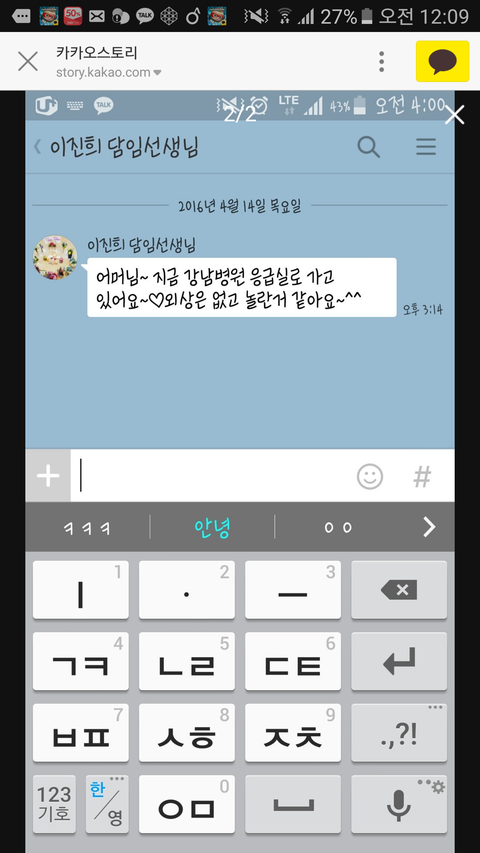 대략 1시간정도 흘렀을쯤 저희아기가 끝내사망했어요ㅜㅜ이게 말이나됩니까 애가 그렇게 될동안 응급차에 실려오면서 걱정하지말라는 하트에 웃음표시 까지있는 카톡을보내왔더군요(사진첨부합니다)