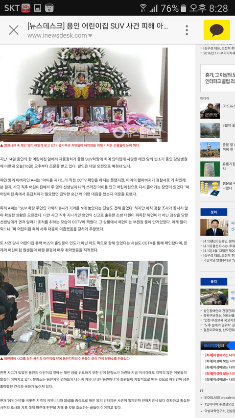 근데 뉴스에서는 차량이밀려 4살여아가 죽은것만 이슈가되서나오네요 정작 어린이집에서 거짓말로 저에게 전화를했고 그런식으로 조치를해서 저희아이를 죽음으로 몰았는데 말이죠 이억울한일을 어쩌면좋을까요 저희아이 3월부터 고작1개월 이어린집에 다닌건데 어쩜 이런일이 생겼는지 너무억울합니다 이글좀 퍼트려주세요 제발도와주세요