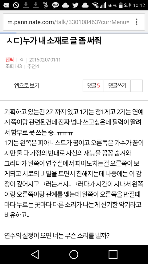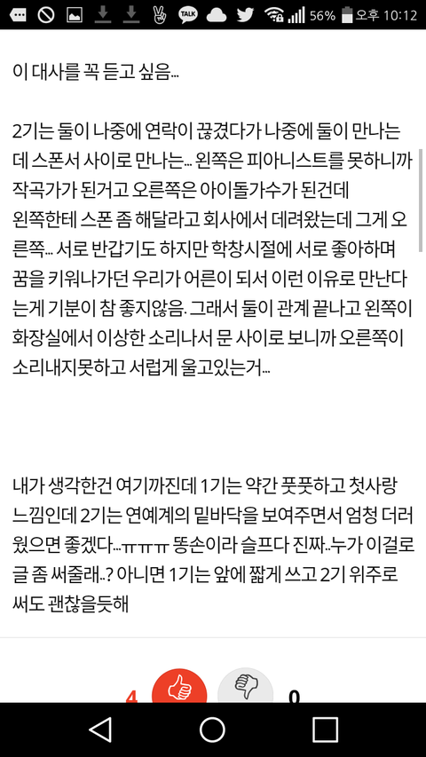 아 누구든 좋으니까 연성 좀 해줘라.... 복습하다가 본건데 존좋이야ㅠㅠㅠㅠㅠㅠㅠㅠ 이거 글쓰니가 자기 필력으로 쓰기엔 너무 아깝다고 연성해달라고 그랬는데ㅠㅜㅜㅜㅜ 금손풍아 이거 연성좀 해라ㅠㅜㅜㅜㅜ