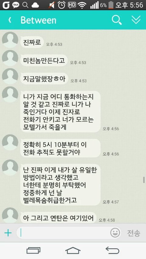 그런데 그게 너무 싫어서 또 씹었더니 한 이틀 지나니까 또 오는거에요 정말로 죽고싶다고 죽을꺼라고하면서 자살할 사람도 구했다고 그러면서 진짜 온갖 욕을 다하고 길에서 마주치면 죽여버리겠다 신발새끼야 진짜 죽여버린다고, 연탄까지 구했다고, 진짜 지가 _같이보이냐고... 이것보다 훨씬 심한 욕들을 계속 해서 너무 무서웠어요