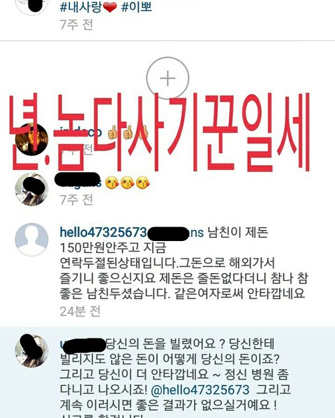 다른 계정으로 인스타를 접속해보니 여자친구와 해외여행중이더군요! 그래서 댓글을 달았더니 그여자친구역시 빌린돈아니라 줄수없다는식이더군요 . 제가 아직 미혼이고해서 이사람들이 우습게 보는건 아닌지 싶네요.