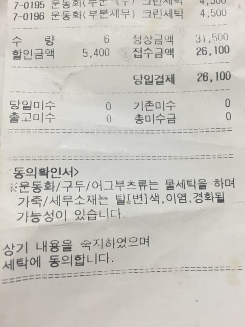 "영수증에 운동화는 물세탁하며 이염될 수 있다고