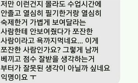 아 미친 진짜 공감 누구는 수업시간에 안 졸려고 간신히 잠 깨면서 작은 거 하나라도 필기하려고 하는데 누구는 수업시간에 편하게 퍼질러 자면서 빌려달라는 게 말이 됨? 그냥 작은 거 하나 물어보는 게 아니라 아예 전체를 베끼겠다는데ㅋㅋㅋ