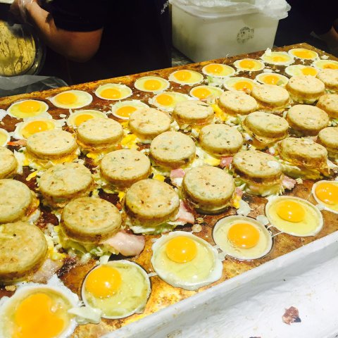 안에는 베이컨, 치즈, 양배추, 양파, 계란 등등