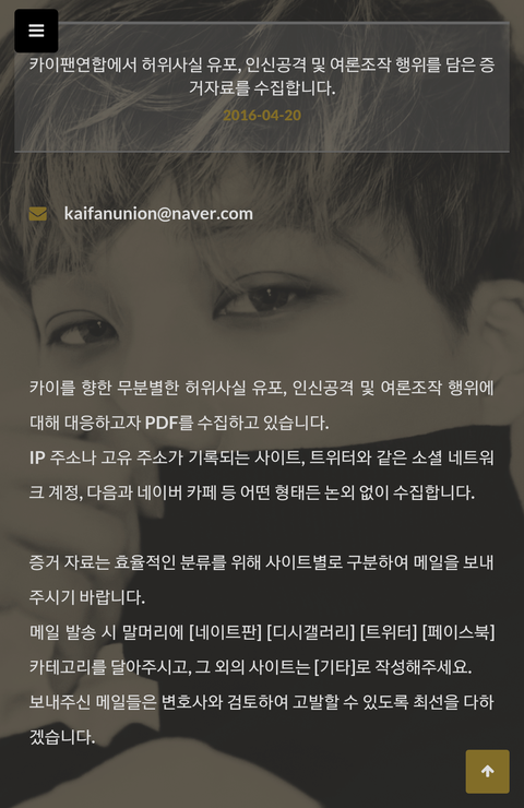 2차 고발에서는 팬 여러분의 참여를 통해 수집한 포털사이트(네이트, 다음, 네이버), 커뮤니티, 트위터 자료를 중심으로 멤버에 대한 모욕, 명예훼손, 루머 유포에 적극 대응합니다. 카이팬연합의 눈이 되어주세요