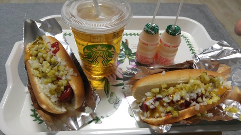 스테프핫도그 만들어 기분내다고 난 스벅잔에 맥주,신랑은 야쿠르트2개