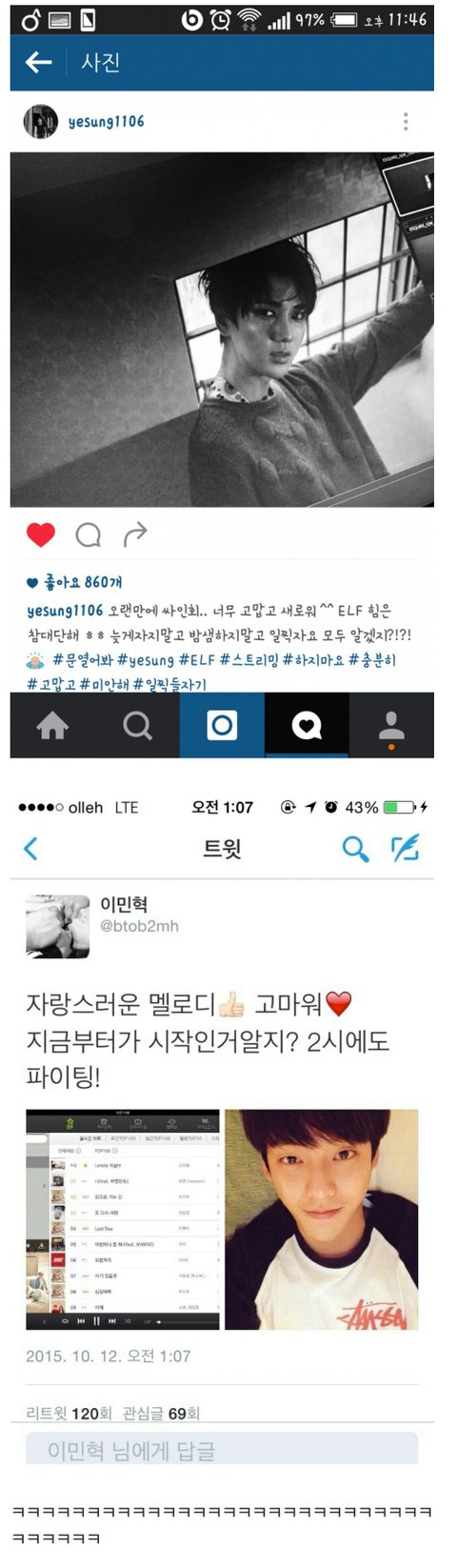 민혁이가 왜 저런거 올린지도 모르면서 이렇게 머리채잡고 또 개지랄떠네. 저거 음원 나온 날 1시에 진입차트 1위못해서 멜로디가 속상해서 멘션보내고 인스타에 댓글 남기고 미안하다고 하니까 올려준거야. 멜로디 속상해하면 제일 먼저 달려와서 토닥토닥해주는 멤버라고 ㅂㅅ아