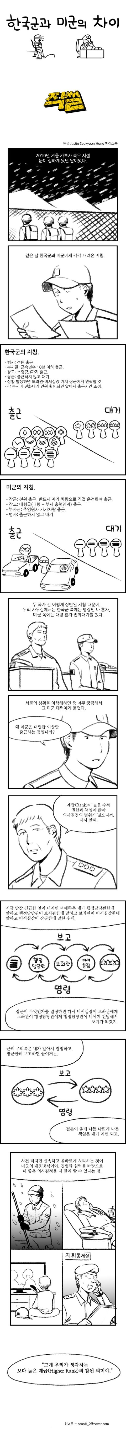 미군 장교가 하는 말이 훨씬 더 체계적이고, 논리적이고, 합리적이고 올바른 방식인데, 한국군대는 완전히 거꾸로 되어있지. 군필자들은 저런 엉터리 체계가 당연하다고 생각하는 것은 지독히 세뇌당했기 때문이고 ㅉㅉ. 마지막에 나오는 4컷의 윗부분이 한국군대의 전체적인 실상을 축소한 것이며, 사병들만 죽어라 고생을 하고, 윗대가리로 올라갈 수록 똥별들은 훈련도 안받고, 골프나 치고, 비리나 일으키면서 놀기만 하는 죄다 더러운 인간들만 존재할 뿐이다.