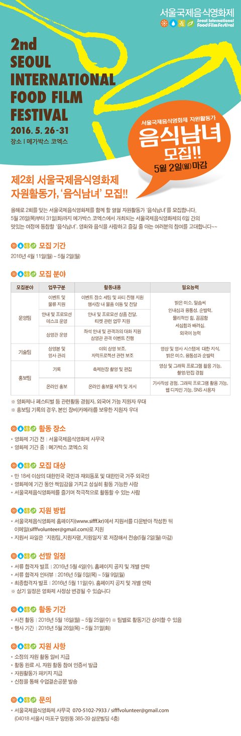 서울국제음식영화제 자원활동가 '음식남녀' 모집 5월 2일(월) 마감!!