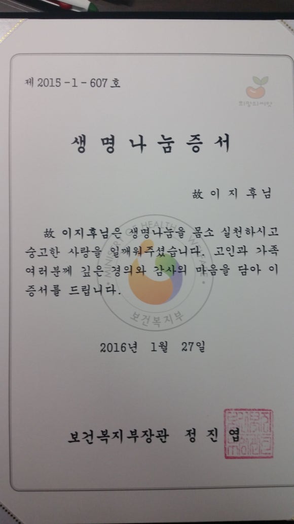 장기기증을 하면, 보건복지부에서 "생명 나눔 증서 "를 주면서 감사해