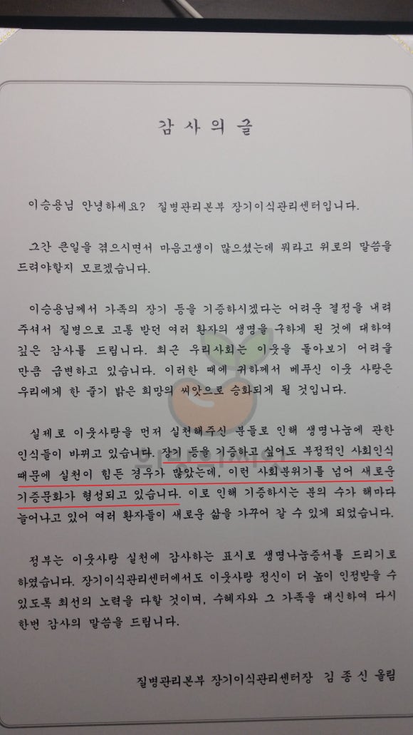 그리고 질병관리본부 장기이식관리 센터장님으로부터 "감사의 글 "을 받습니다