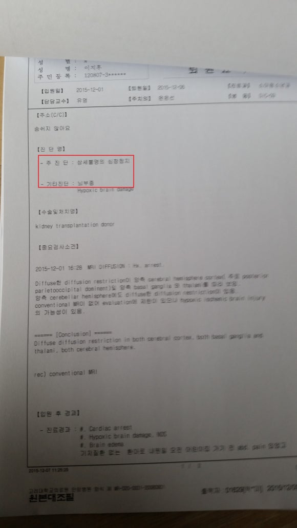 사망진단코드가 있는 뇌부종 사망이 될 수밖에 없었고