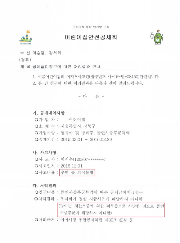 제 아들은 지난 2015년 12월 어린이집에서 돌연사 하여, 장기기증으로