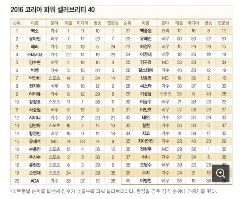 2016 한국 파워 셀러브리티, 엑소 2년 연속 1위