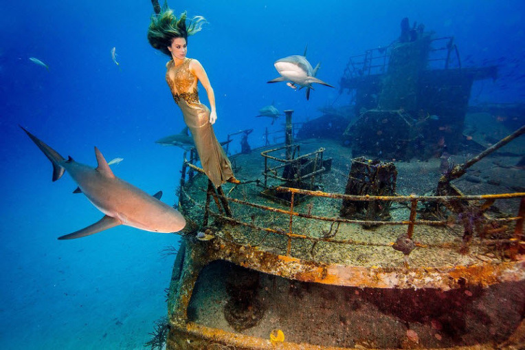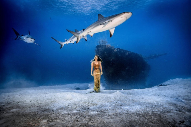 상어 떼들이 가까이 다가와 주변을 맴도는데도 자연스럽고 우아한 포즈를 취한다.