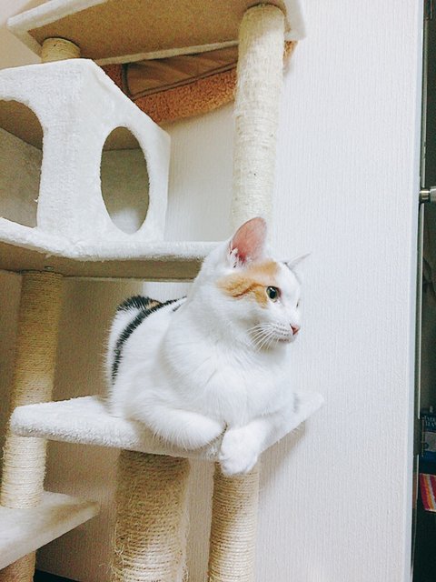 퐁타와 모모카가 남집사와 제 무릎에 한 마리씩 올라와 앉아있고, 나나코는 혼자 캣타워에 올라가 있는 게 보통이에요.