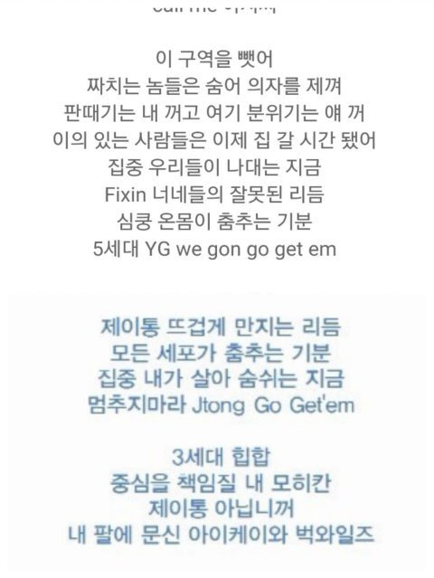 라임의 포인트가 되는 단어몇개를 따와서 형식을 그대로 유지한 상태로 자기가사를 썼고 제이통가사중 3세대힙합을 인용해 5세대YG라고 자기식으로 재해석함