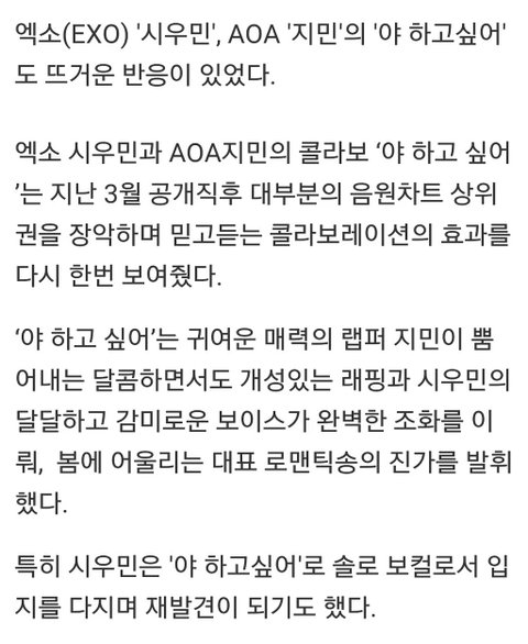 특히 시우민은 '야 하고싶어'로 솔로 보컬로서 입지를 다지며 재발견이 되기도 했다 맞아 젤 뿌듯한 부분ㅜ