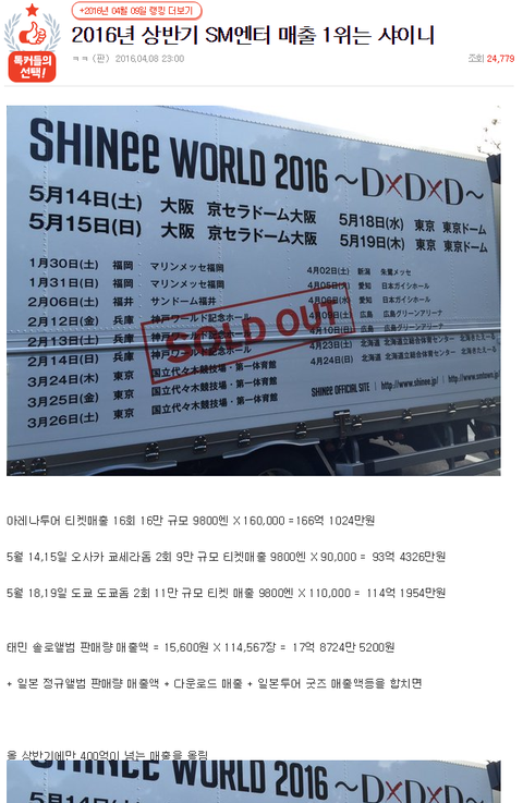 9년차라는 2016년 상반기는 국내 완전체 활동 없이 돔공연, 솔로활동만으로도 무려 400억 이상의 매출을 올리는 쾌거 달성