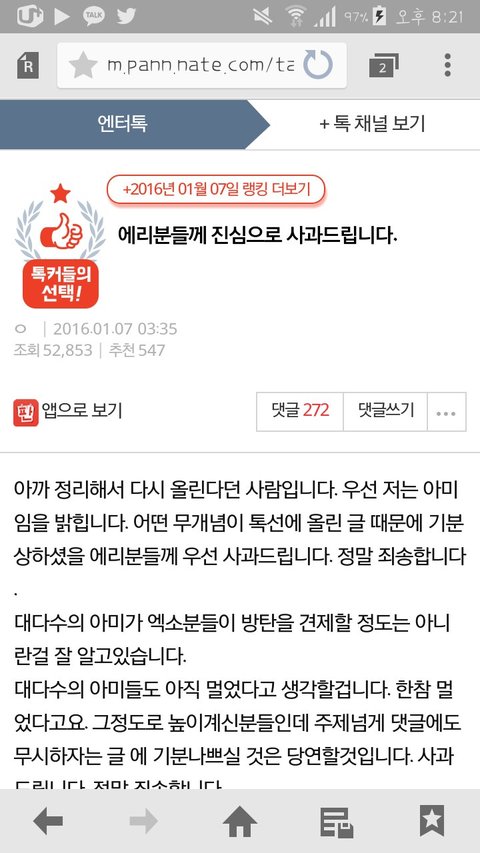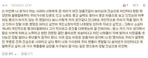 ++) 우리가 사과를 안 했다고 하는 애들은 진심 머가리 병1신 맞음ㅇㅇ 그 글 1등 베플부터가 사과글이었고 우리 그 글 초반부터 죄송하다 저 홈마 우리도 싫어한다 이 글로 도배가 되어 있었고 그쪽에서도 가수는 건드리지 말자며 조카 훈훈한 분위기였는데 왜 갑자기 우리가 사과 안 한 게 됨? 나 쨲쨲이에서 우리 무개념 팬이 넴텍 쉴드치는 거 개쪽주면서 조카 욕 하고 왔어ㅠㅠ