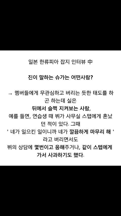 솔직히 슈가 성격이 좋아.....?나 아미지만 내 주변에는 윤기같은 성격인 애는 거의 인간관계 안좋고 싸..가지..로 분류되던데?정국이,지민이,태형이,석진이 이런애들 성격이랑 비교되지 않아?맨날 자기 편한건만 할라하고 가만보면 힘든건 아무것도 안함..민군주거리는거 이해안감