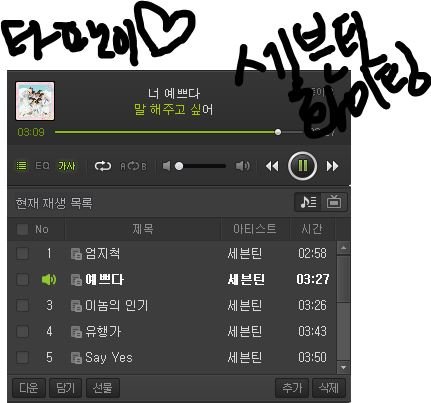 아직 제가 파는 가수 음원이 안나와서 셉틴꺼 스밍하는 중입니다..ㅋㅋ