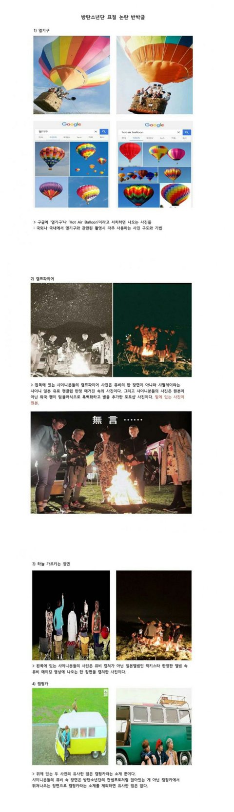 또한, 상당히 긴 글이기 때문에 간단한 문장으로 설명하고 있으며, 내용을 최대한 간추리기 위해서 이미 보셨을 타그룹의 의혹제기 사진은 보충 설명이 필요할 시에만 들어가며 대부분은 방탄소년단의 사진자료로 들어감을 미리 알려드립니다. 또한, 내용이 깔끔하지 않고 조금 난잡하다고 느끼실 수 있는 점 양해 부탁드립니다.